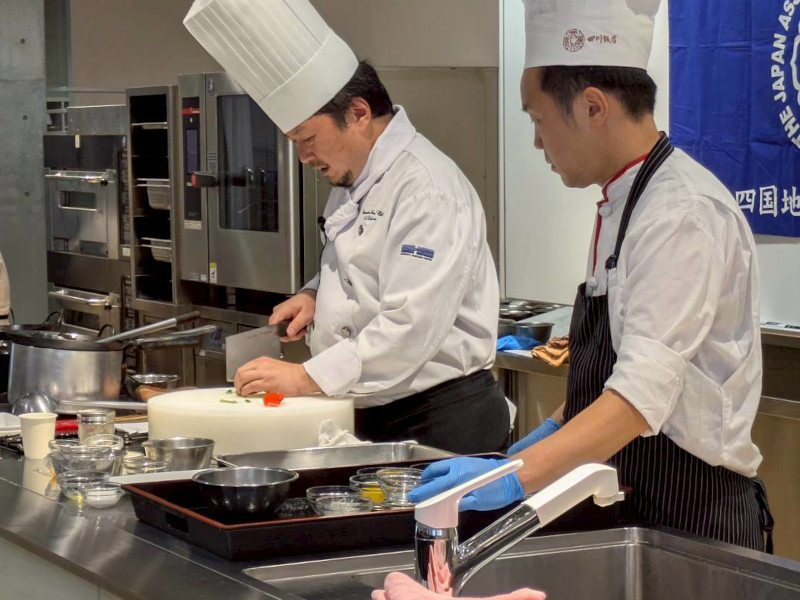 実演助手に水本青年部長、残りの試食分は函館国際ホテル中華調理部の木村滉太氏と愛媛県支部青年部が中心となり協力してバックヤードで調理しました。