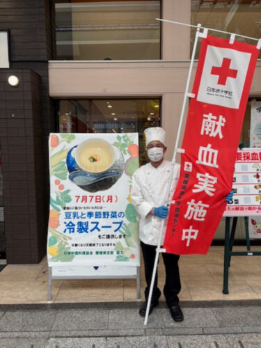 愛媛県支部(重松寿支部長)では、7月7日、午前10時より、日本赤十字社大街道献血ルームにおいて、「豆乳と季節の野菜の冷製スープ」100人分を献血者の方々に提供しました。