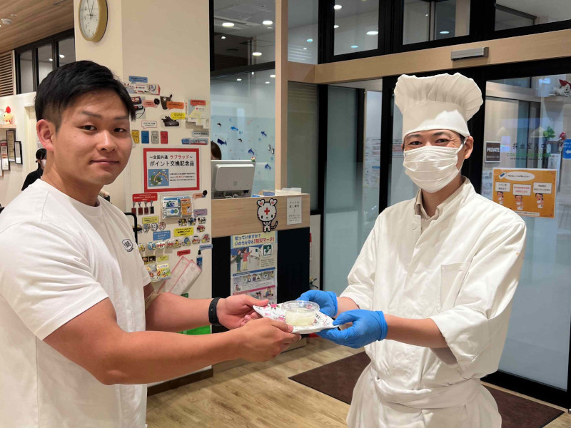 カルピスのゼリーベースにライムのシロップをかけた、さっぱりとしてツルンとのどごしの良いデザートで献血者の皆様にも大変好評をいただきました。